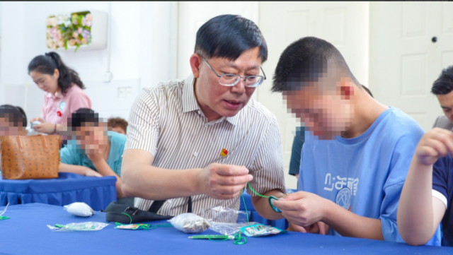 了解完端午知识,就到了手工制作环节 —— 制作香囊与五彩绳。志愿者们来到孩子们身旁,一对一耐心指导。只见志愿者先拿起彩色丝线,向孩子们演示如何编织五彩绳,孩子们学得有模有样,小手虽然不够灵活,但那份认真劲儿丝毫不输常人。制作香囊时,孩子们把艾草、香料等装进小巧的布袋,再用彩绳系好,一个个精美的香囊便在他们手中诞生。这些香囊不仅散发着清幽的香气,更承载着大家对孩子们健康平安的美好期许。